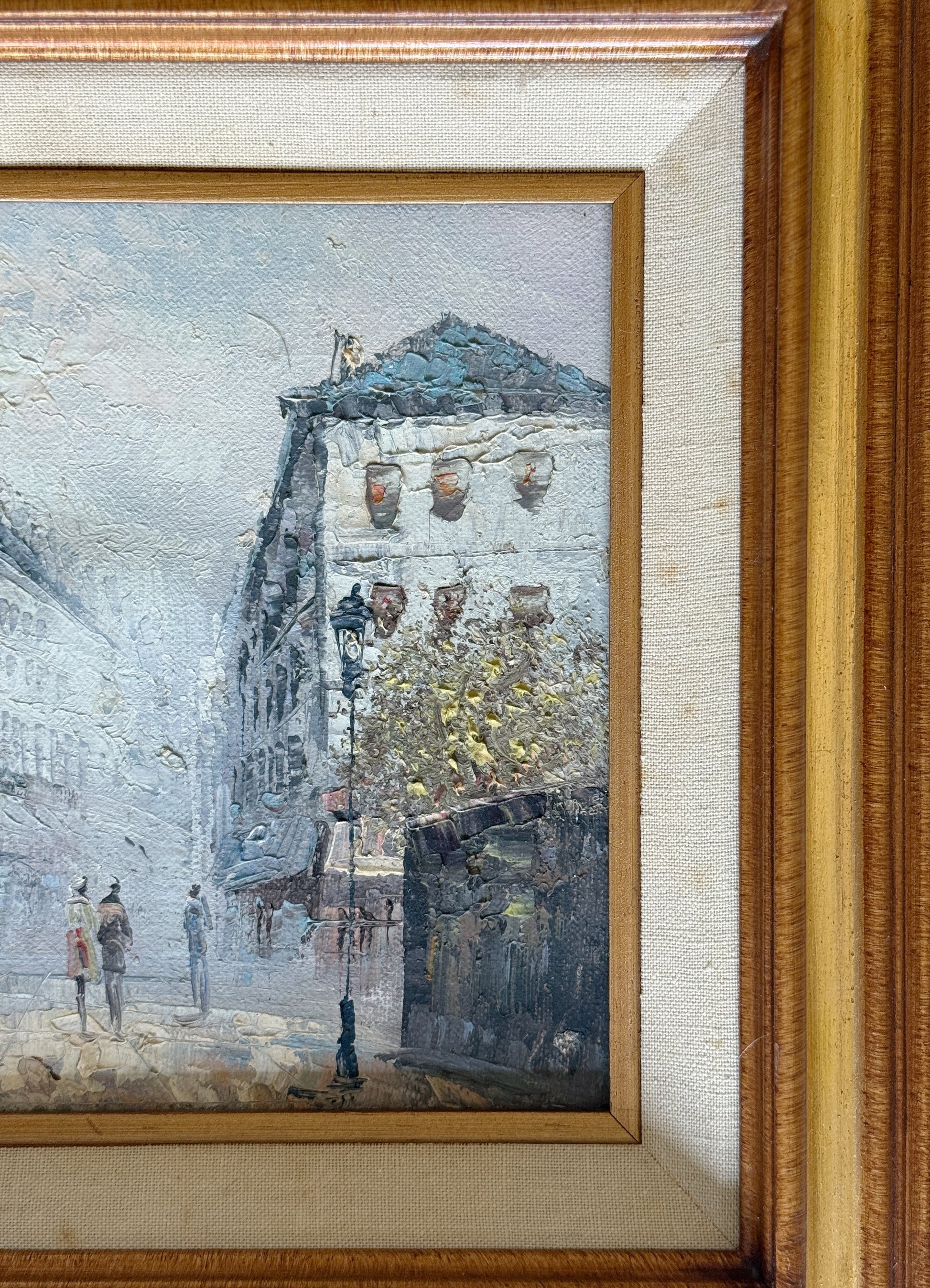A vintage framed oil painting of a European cityscape in the impasto style of painting. Soft muted use of color in a vintage gold frame with linen accent.